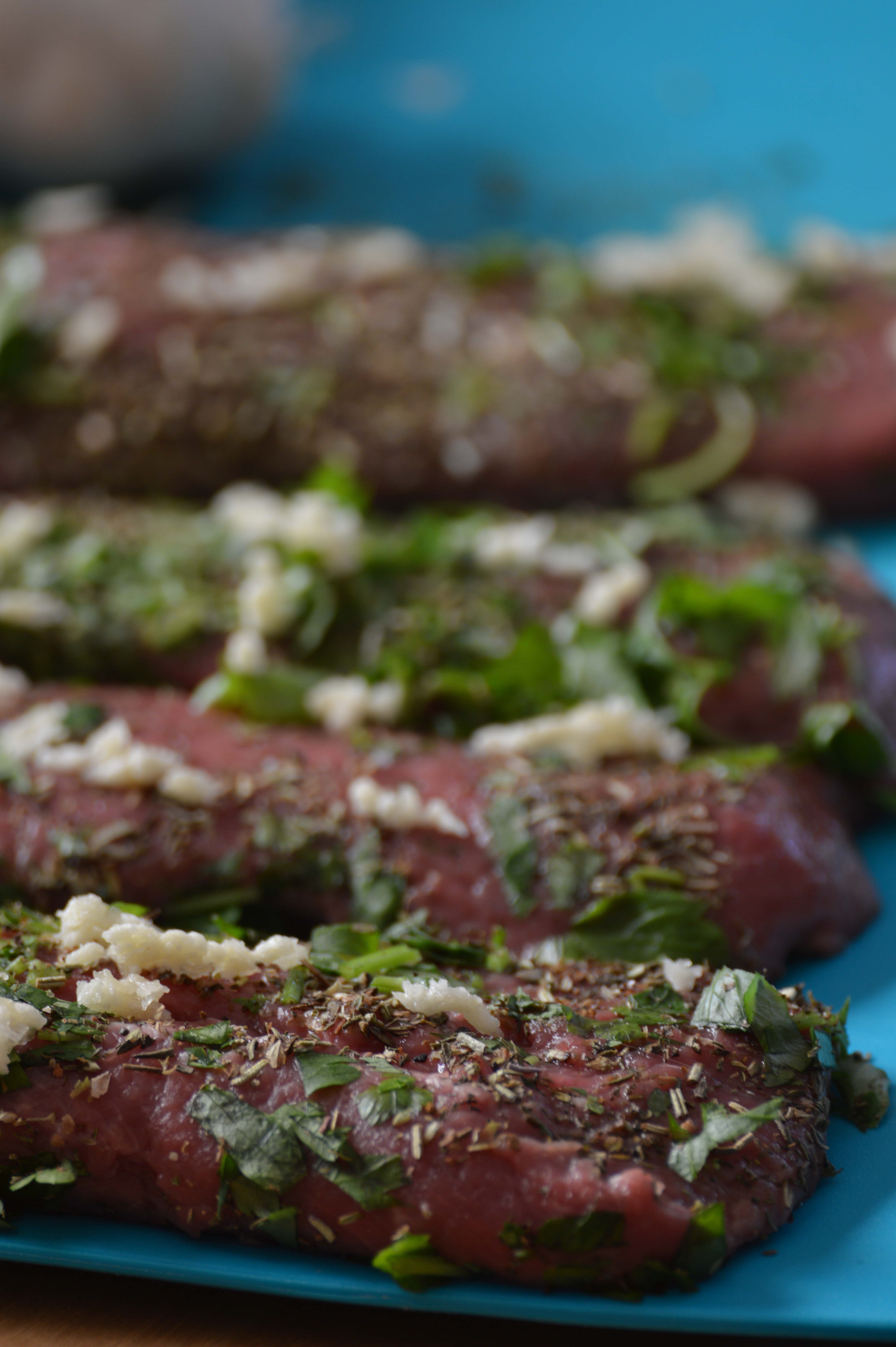 Hacka örterna och blanda med vitlöken på en skärbräda. Rulla köttet i hacket och klappa lite så att örterna fäster. Salta och peppra. Hetta upp en stekpanna och bryn köttet runt om. Lägg över i en ugnsform, stick in en stektermometer och stek i ugnen till 58-60 graders innertemperatur, ca 20 minuter. Låt köttet vila i folie i 10 minuter innan du skivar upp det.