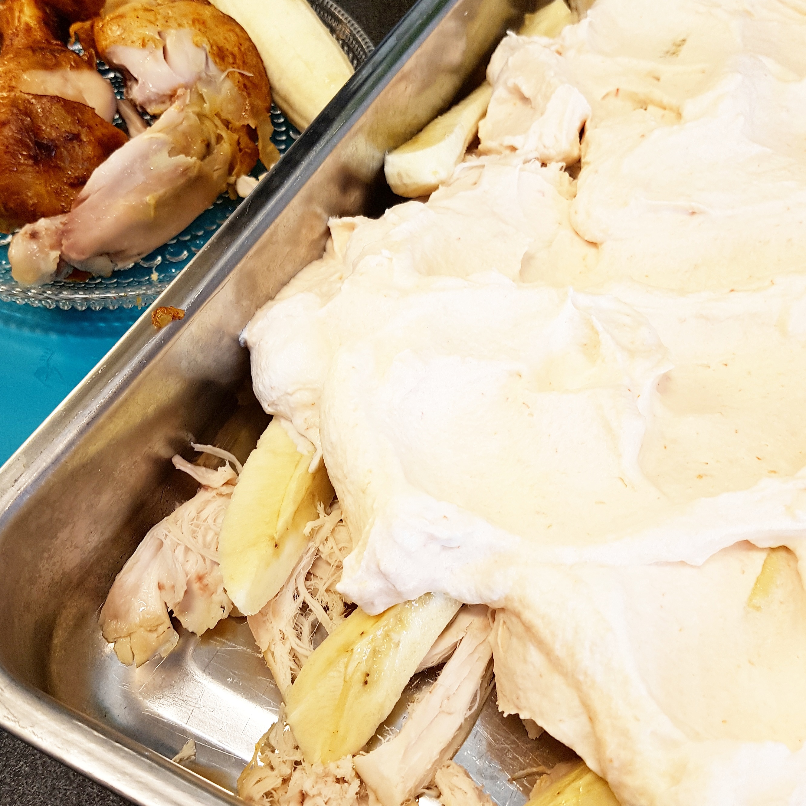 Sätt ugnen på 225 grader. Ta bort skinn och ben från den grillade kycklingen. Skär kycklingköttet i mindre bitar. Skiva bananerna. Lägg kycklingköttet i en ugnssäker form. Lägg bananen ovanpå.