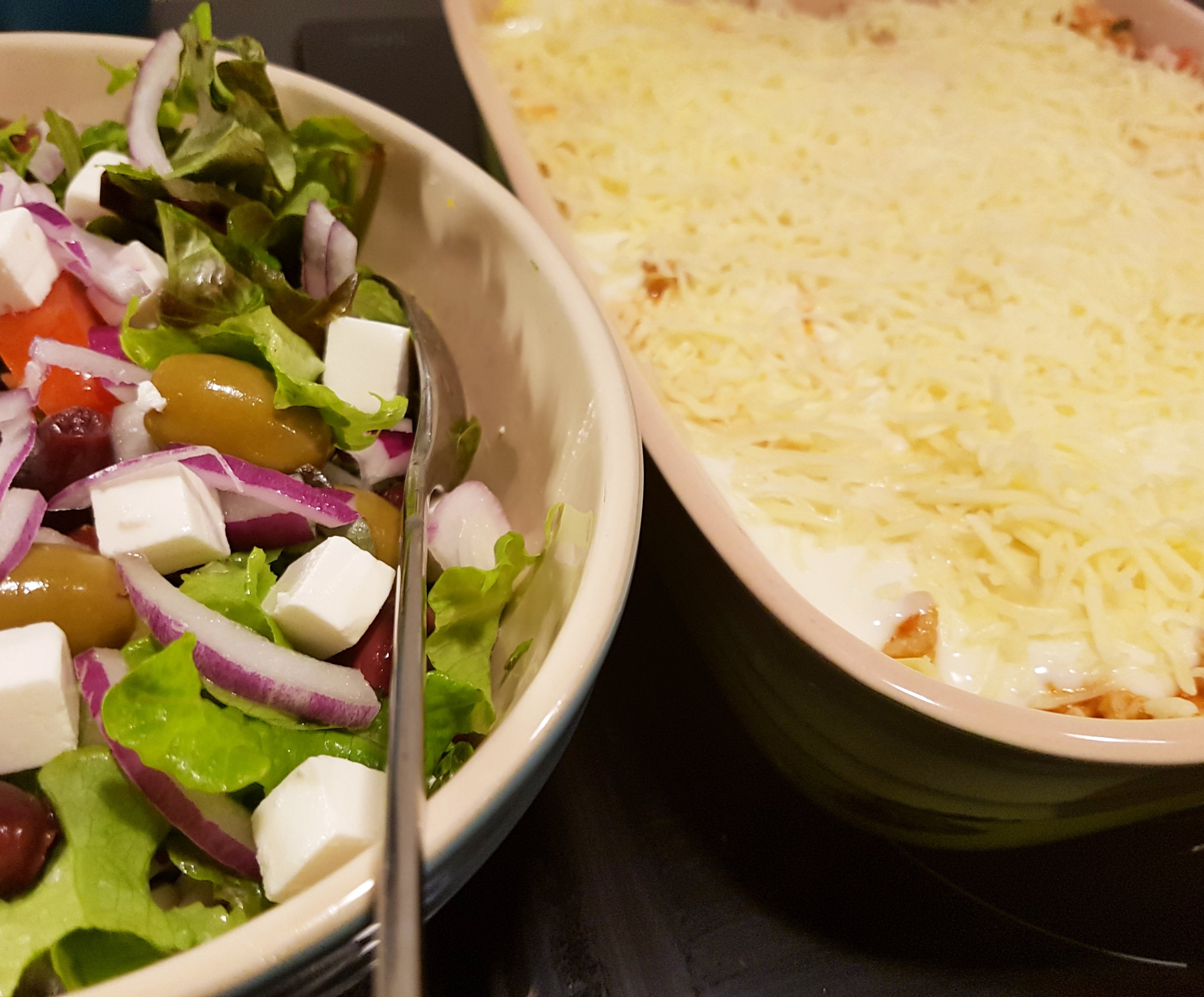 Stek spenaten hastigt i lite olja. Salta och peppra lätt. Smörj en rektangulär form och häll lite av ostsåsen i botten. Varva sedan lasagneplattor, kycklingfärssås, ostsås och stekt spenat. Översta lagret ska vara lasagneplattor och ostsås samt den resterande rivna osten.