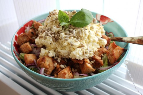 Denna sallad fick jag receptet på av Olivado, mycket gott, lchf vänligt  & påminner om ceasarsallad! Ni glömmer väl föressten inte att tävla om oljorna i samarbete med Spisa.nu och Olivado? 🙂 Klicka på bilden så kommer du dit!