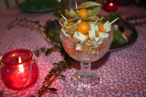 Äter man tapas ska det gärna finnas ostar med, här använde jag två sorters spanska ostar på tandpetare, Manchego & Pata Cabra Semicurado tillsammans med physalis.
