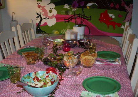 Tavlan i bakgrunden har jag & Emmis gjort av ett Ikea tyg som vi spänt över en Frigolitskiva, gillar det där tyget! 🙂 (Har inget med maten att göra men där hamnade tavlan då det var klar…)
