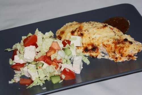 Sätt ugnen på 225 grader. Lägg laxen (tinad) i en smord ugnsform, salta & peppra. Rör ihop ostarna, creme fraiche och sweetchili, bred ut över laxen. Gratinera i 20-25 minuter. Servera med ex kokt potatis, sparris och en sallad!