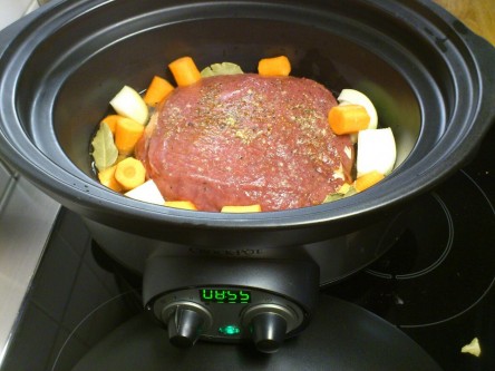 Kl 08.00 satte jag ner 1½ kg rostbiff, 2 gula lökar i klyftor, 3 morötter i bitar, 2 dl vatten, 1 dl rödvin och en buljongtärning i Crock-pot. Låg värme i 9 h på timer! Gissa om det doftade underbart i stugan när man öppnade dörren 7 h senare!? Då var köttet redan så mört så det föll isär…