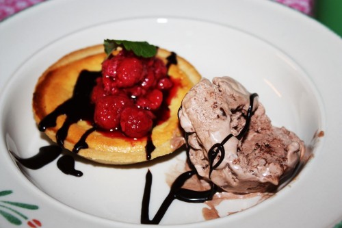 Ingen dessert ingick så den fixades snabbt själv med mandelpajer, chokladglass & hallon!