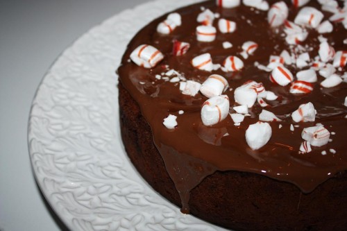 Smält chokladen till glasyren i vattenbad och ringla över kakan. Strö över krossade polkagrisar.