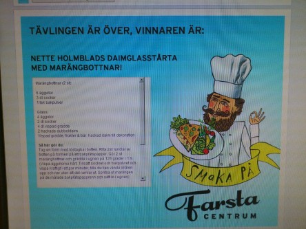 Fick ett trevligt mail på jobbet, att jag vunnit recepttävlingen ”Smaka på Farsta” Med min Daimglasstårta! 🙂 Nu blir det lite trevlig shopping med presentkortet som var vinsten. 🙂 Made my day!