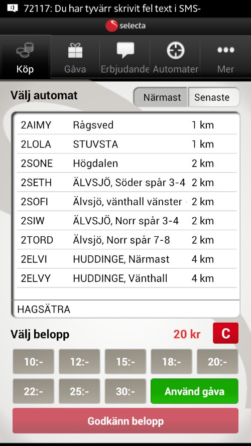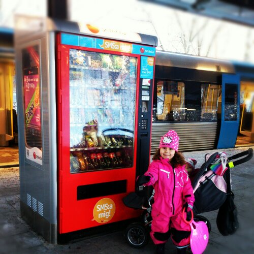 Idag åkte vi lite tåg jag och tjejerna, underbart väder dock lite kallt, fick testa selectas app att köpa ”enkelt” på stationerna men den lockade inte mig! Skulle handla 2 produkter för 10 kr st, laddade automaten med 20 kr via appen men efter första produkten kom försvann de resterande pengarna med! Dessutom kostar tjänster 3 kr. + sms kostnad så jag föredrar den vanliga varianten med riktiga pengar!