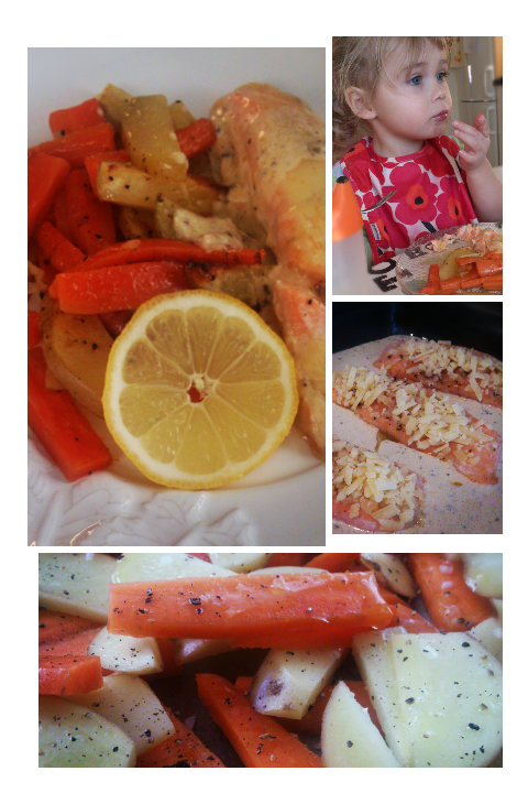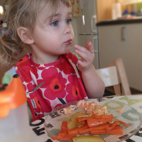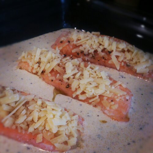 Den är allt bra den där finska musta Pekka (pepparost).. Funkar lika bra till en bit kött som till lax! Idag smälte jag ner den tillsammans med 3 dl matlagningsgrädde som jag sen hällde runt laxen när det var ca 10 minuter kvar i ugn! (toppade laxen med lite västerbottensost) Kidsen moffade i sig allt på faten!