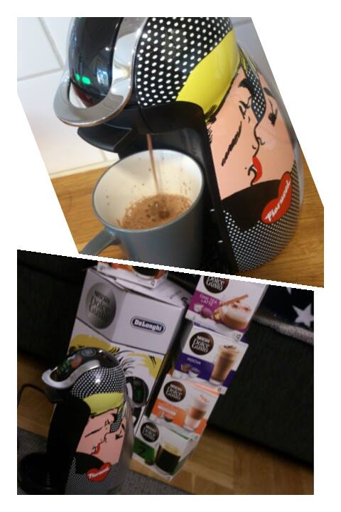 Sååå nöjd med min nya fina Dolce Gusto maskin, totalt förälskad i den nya designen som är ett samarbete mellan Dolce Gusto och Fiorucci! Denna skönhet står placerad på mitt jobb och väntar att få förgylla fikarasterna för mig om mina kollegor! 🙂 Gillar att man kan köpa kapslarna i vanliga mataffären till ett överkomligt pris och i massa olika smaker, inte enbart kaffe! Vad har ni för kaffemaskin, eller kör ni vanlig hederlig bryggare? Här har jag både vanlig bryggare, Nespresso och nu denna…. 🙂