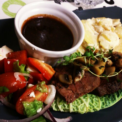 Jag gjorde dock helstekt nötytterfilé med fransk potatisgratäng, vitlöksfrästa champinjoner och rödvinssås! Vi tyckte alla att smaken kombinerades bra med vinet!