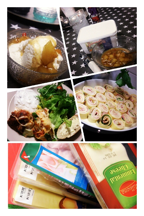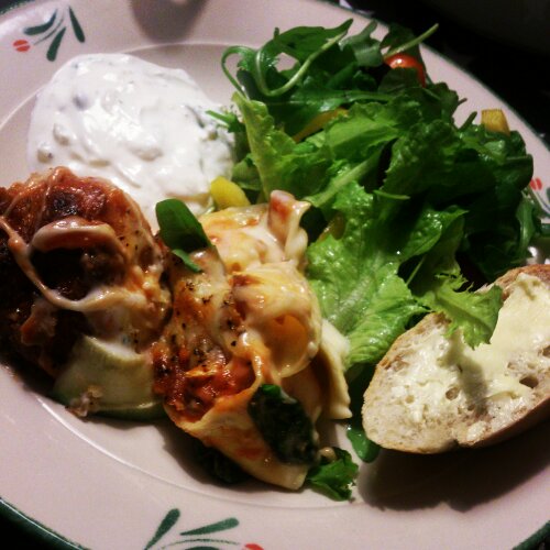Häll ett lager med bechamellsås i botten på en ugnsform. Skär pastarullarna i ca 3 skivor var. Lägg dessa ”stubbar” med snittytan uppåt i formen. Häll över resterande bechamellsås. Ringla över tomatsås efter smak. Strö över riven ost (emmentaler även här eller annan smakrik ost). Salta & peppra. Ställ in formen i 225C ca 20 min. Servera genast. Jag hade en sallad med ruccola och oliver till, Tzatziki samt surdegsbaguette!
