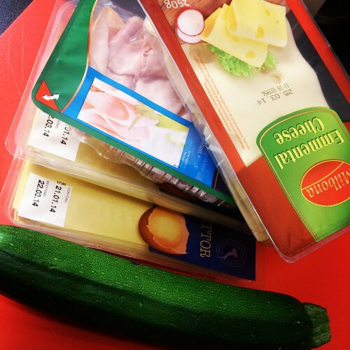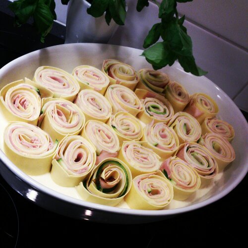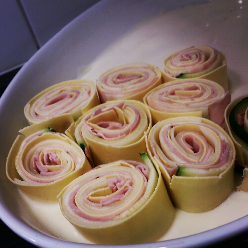 Bred ut två lasagneplattor efter varandra (så de överlappar lite) ungefär lika långa som en vanlig skärbräda. Täck med skivor av emmentalerost. Skär skivor av zuccinin med osthyvel och lägg ovanpå osten. Toppa med skinka. Rulla i hop rullarna hårt (från kortsidan) och plasta in i plastfolie och låt ligga kallt i en stund (då är det lättare att skära dem i fina bitar som håller i hop).
