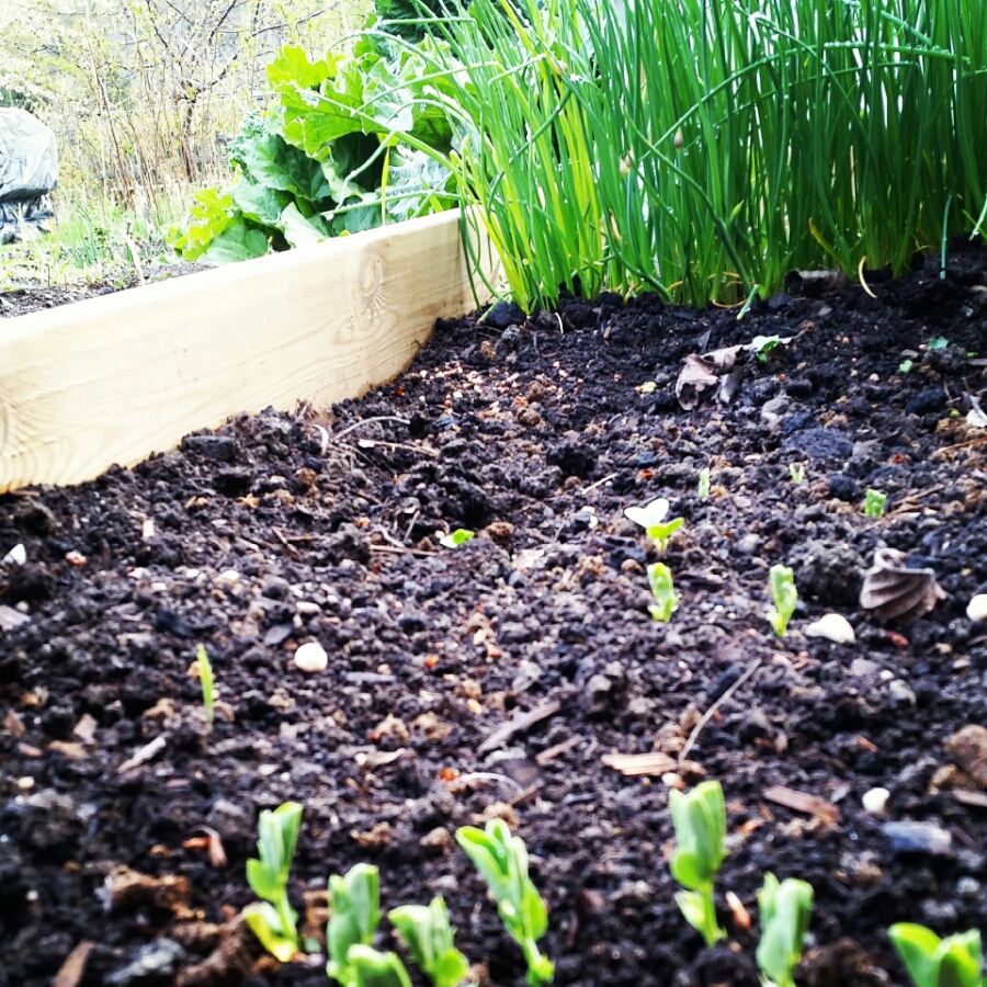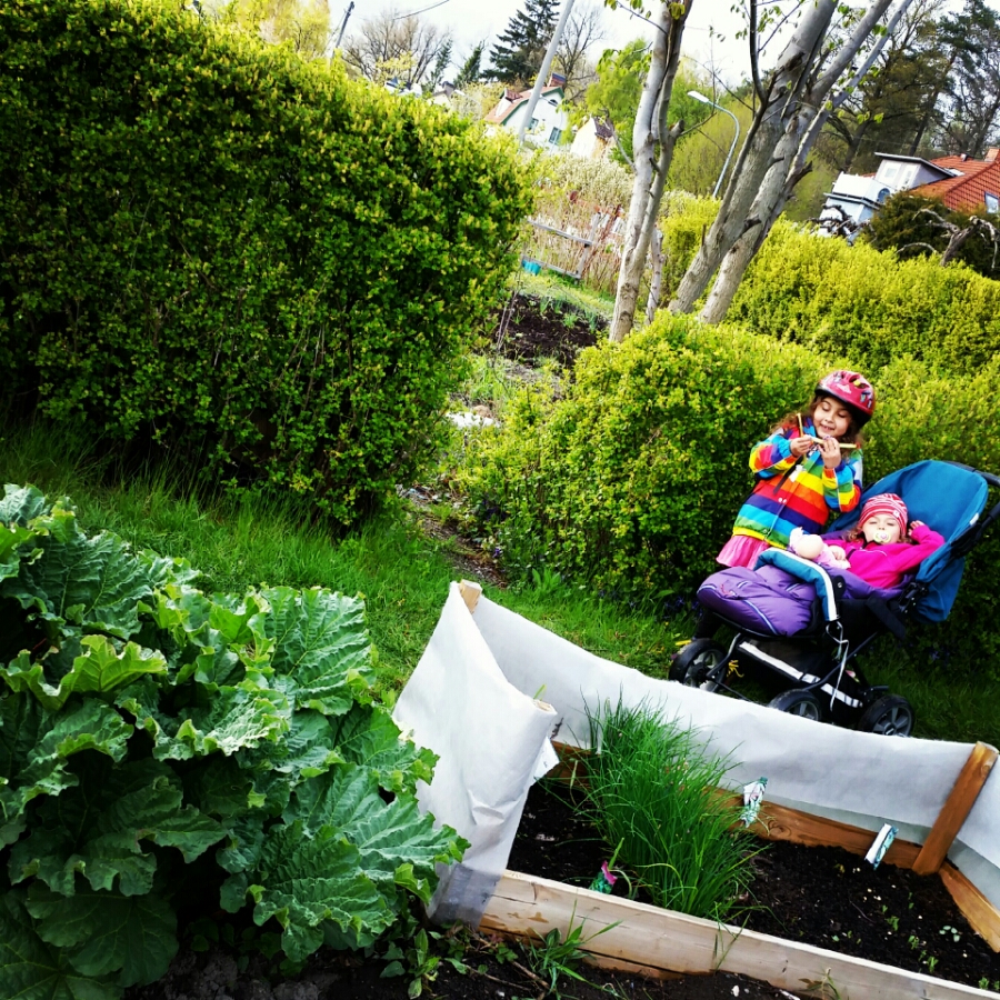 En liten kvällsöversyn  av kolonilotten behövs, där både det ena och det andra växer så det knakar! 🙂 Väntar att våra egna potatisar ska kika fram… Har satt en tidigt sort ”Amandine” som är en fransk delikatess potatis!