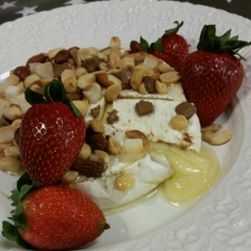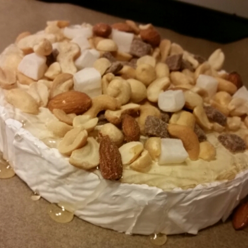 2. Lägg brietårtan på en plåt med bakplåtspapper. Skär ev frukt och nötter i mindre bitar och blanda dem med honungen.