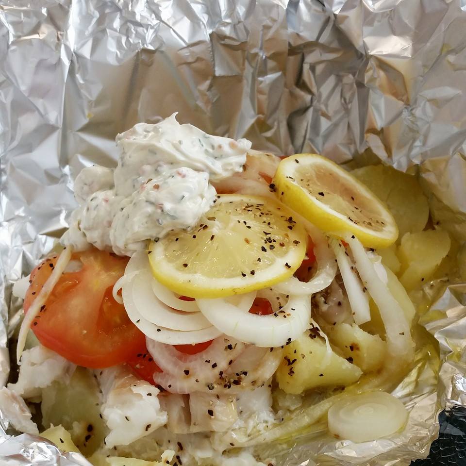 - Toppa med citronskivorna och smörklickar på torsken. Förslut fiskpaketet ordentligt. Stek i ugn i 20 minuter.