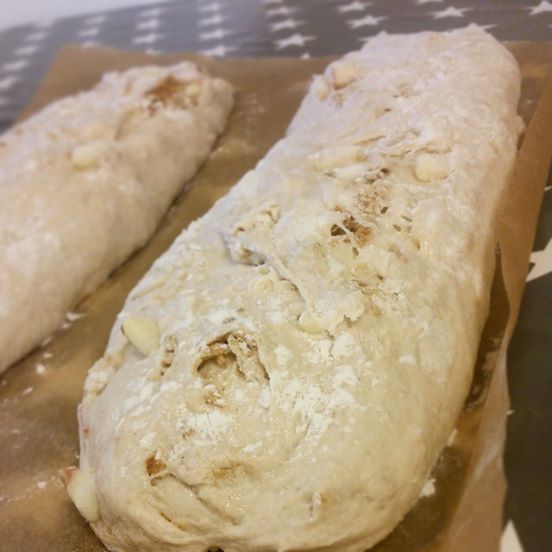 - Tag upp degen på mjölat bakbord och forma snabbt till två limpor eller baguetter. Degen behöver inte knådas ytterligare.
