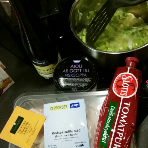 - Tillsätt vin och buljongtärning. Koka ett par minuter. Rör ner grädde, crème fraiche, vatten och saffran. Sjud i 15 minuter.