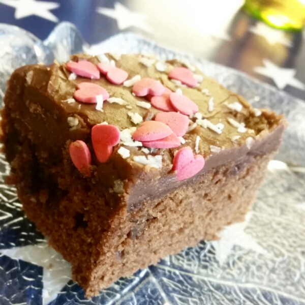Koka under tiden upp glasyren. Smält smöret, häll ner kaffet och dra av från plattan. Rör ner övriga ingredienser. Låt kakan svalna lite och stick några små snitt med en kniv huller om buller över kakan så glasyren kan rinna ner lite inuti. Avsluta med att strö över kokosflingor el strössel nu till alla hjärtans dag. Låt svalna innan du skär upp i rutor.