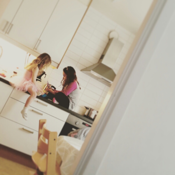 Tjejerna är inne i baksvängen och gärna enkla saker som de klarar av själva, denna äppelkaka behöver inte ens vispas, bara röras ihop! Väldigt god är den också… 🙂
