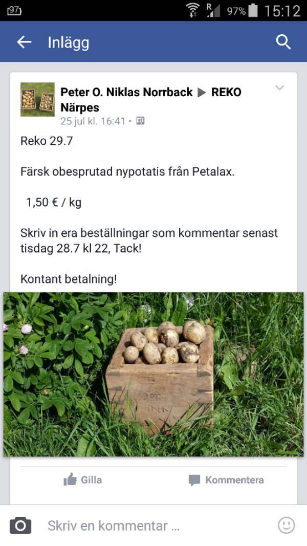 Efter att ha varit här i Närpes på semester och sett hur de gör med sina ”Reko-ringar” där producenterna säljer sina produkter i en grupp på Facebook direkt till konsument utan mellanhänder och sen få plocka upp allt på ett samlingsställe så har jag och en vän blivit så inspirerad att vi startat liknande i Norra samt Södra Stockholm! Gå med i gruppen EKO REKO på Facebook om du som konsument också vill äta bra och rejäl mat från närområdet!
