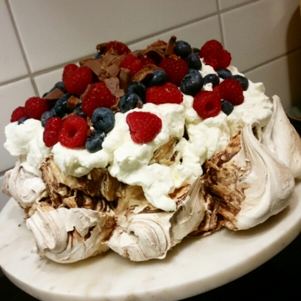 - Vispa grädden fluffig och skeda den över marängen. Strö över färska bär.