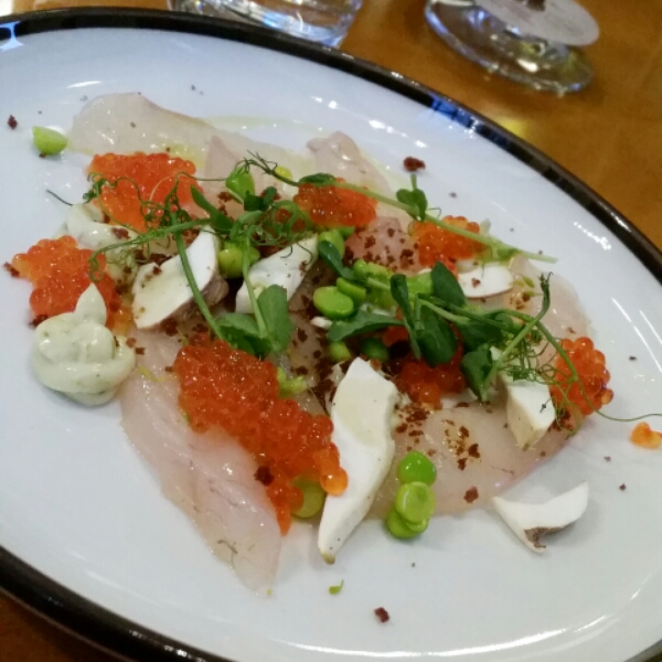 Rimmad gös med skivad rå svamp, krondillsemulsion och forellrom