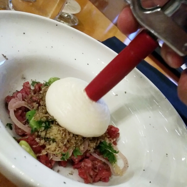 Råbiff på innanlår med potatisskum, bondbönor, krasse och picklad schalottenlök