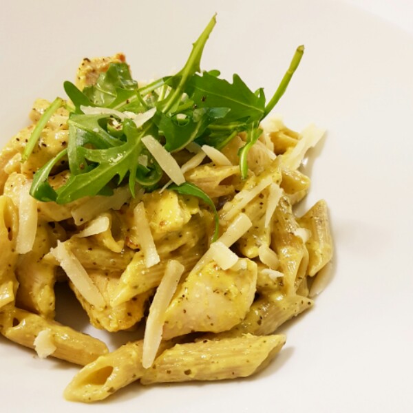 2. När kycklingen börjar få färg, häll i grädde, parmesan och pesto. Rör om så att allt blandas.