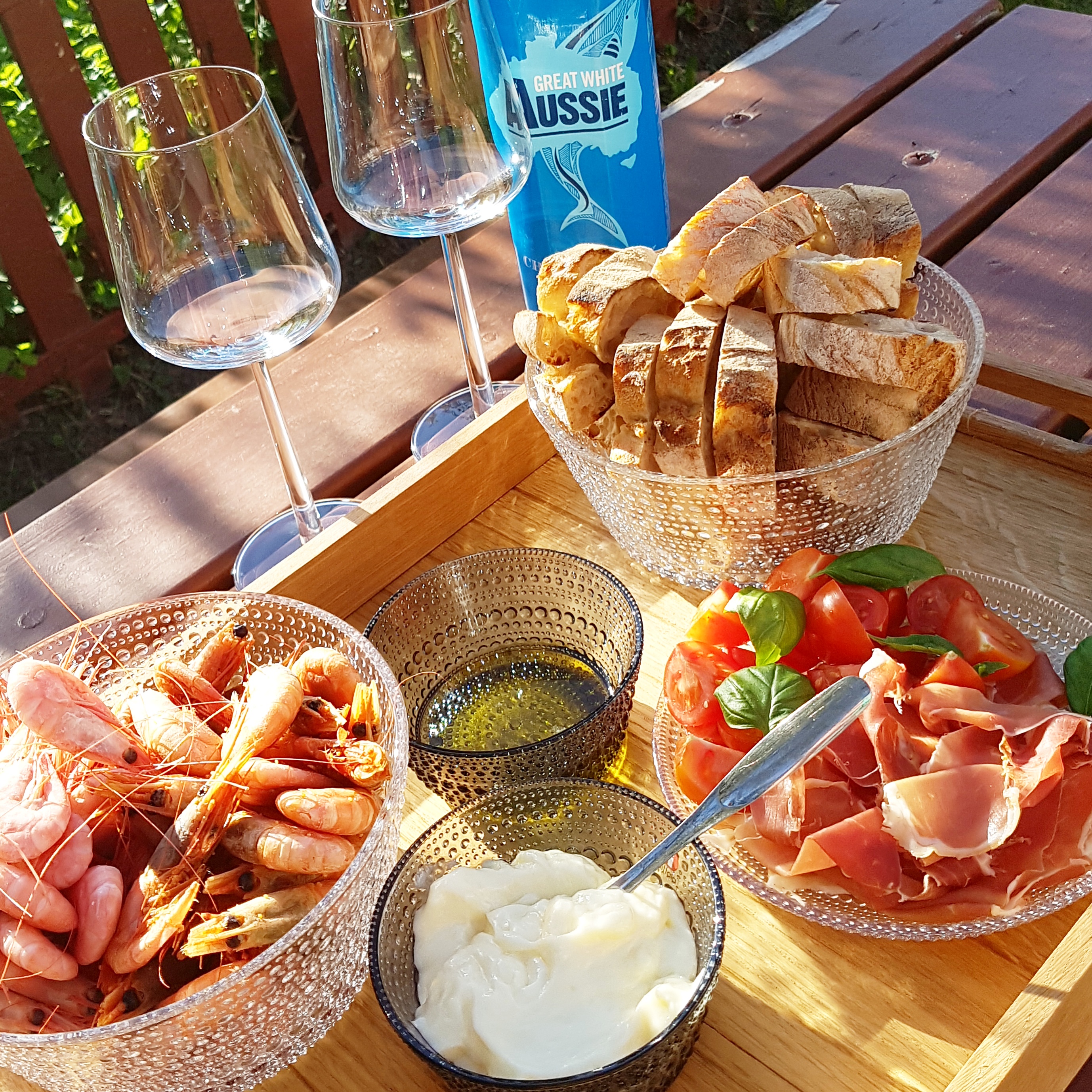 Testade ytterligare ett tetra vin ” Great white aussie” chardonnay. Vinet i sig var bra men passade inte riktigt till de rökta räkorna. Fruktigheten i vinet slog igenom lite för mycket så skulle rekommendera en lättare fiskrätt till!