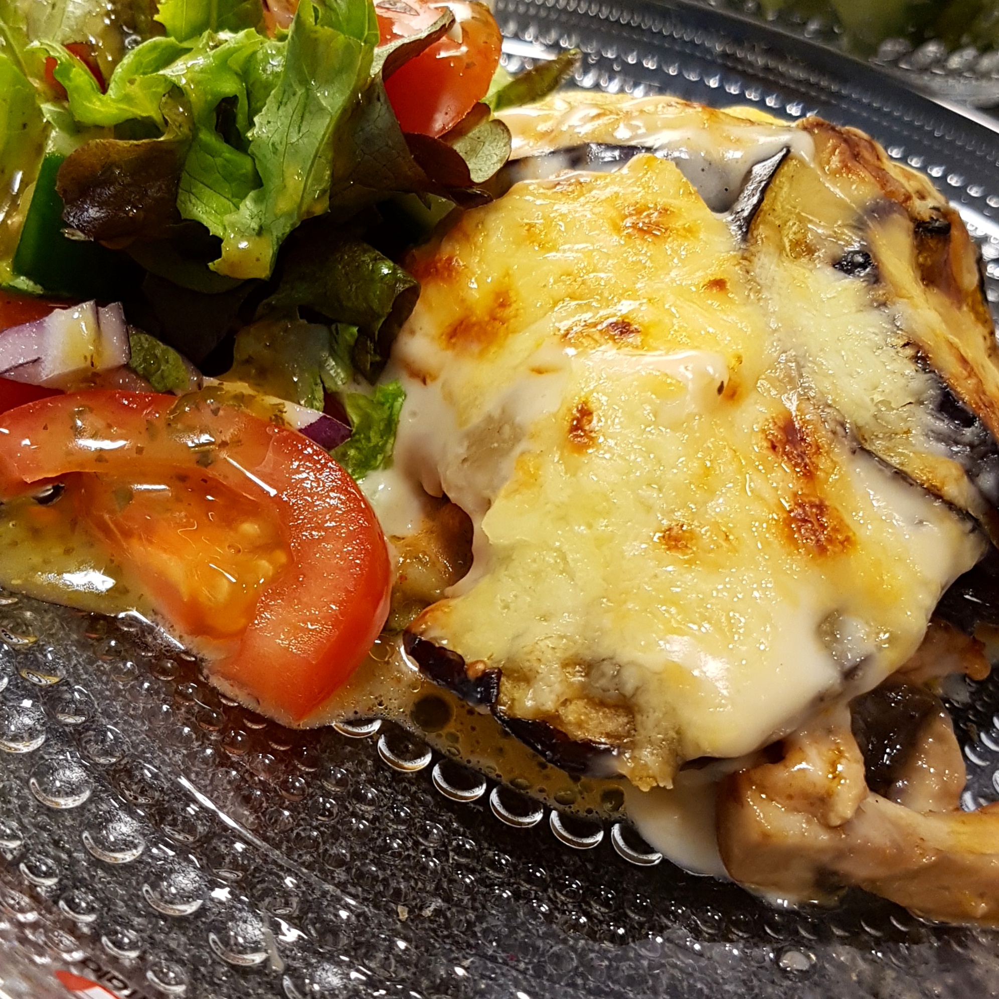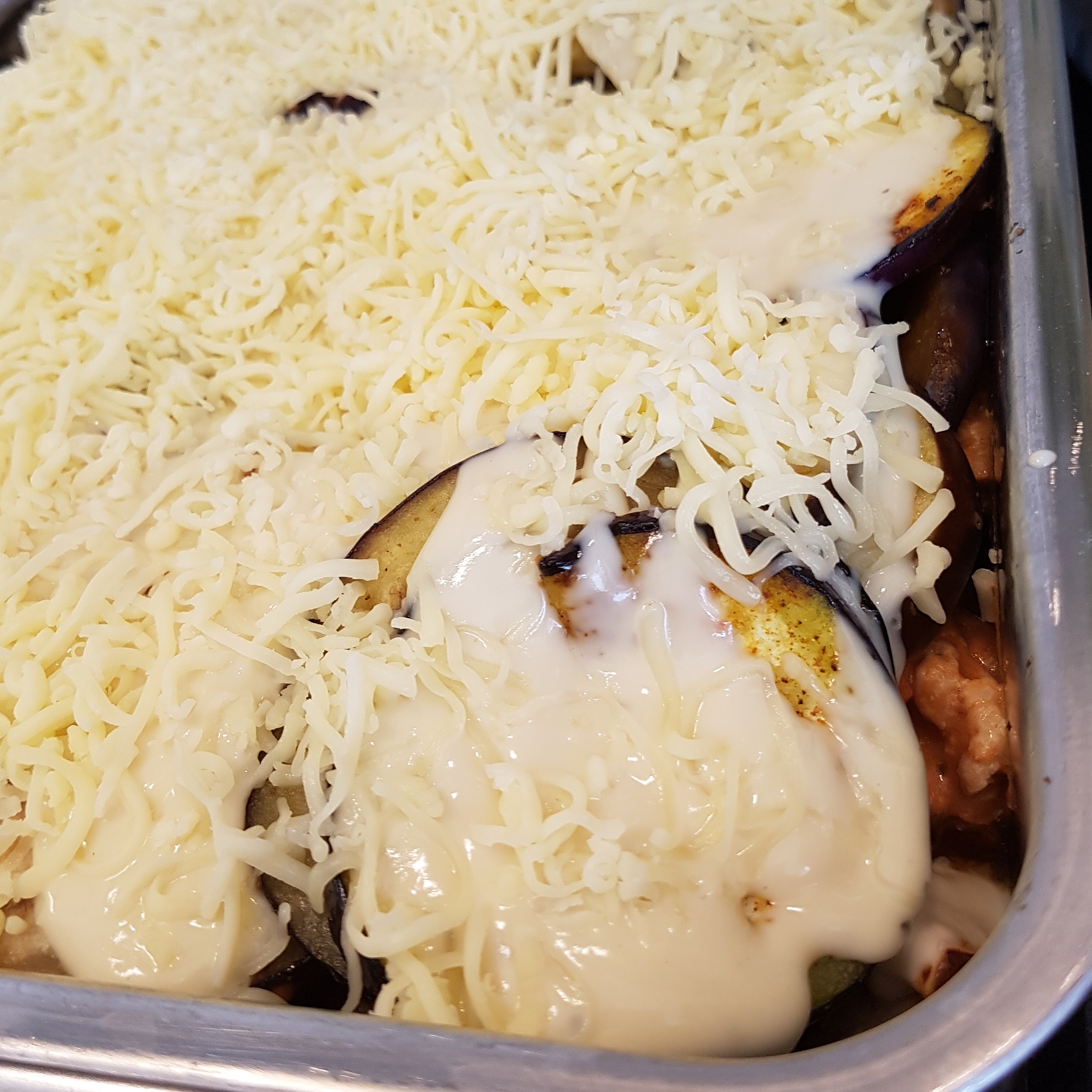Sätt ugnen på 225°. Skär aubergine i centimetertjocka skivor och lägg på hushållspapper. Strö över salt. Skala och hacka löken och vitlöken. Fräs mjuk i smör i en stekpanna. Lägg i köttfärsen och stek den under omrörning så att den smular sig. Tillsätt krossade tomater, tomatpuré, kanel, salt och peppar. Låt såsen koka ca 5 min. Vispa ut mjölet i hälften av mjölken i en kastrull. Häll i resten av mjölken och låt det koka upp under vispning. Låt såsen koka ca 3 min. Rör ner 1 1/2 dl av osten, salt och uppvispat ägg. Torka av aubergineskivorna och stek dem i smör i en stekpanna ca 1 min per sida. Varva köttfärssås och aubergineskivor i en smord ugnssäker form. Häll över såsen och strö över resten av osten. Grädda i nedre delen av ugnen ca 30 min. Servera med en grekisk sallad!