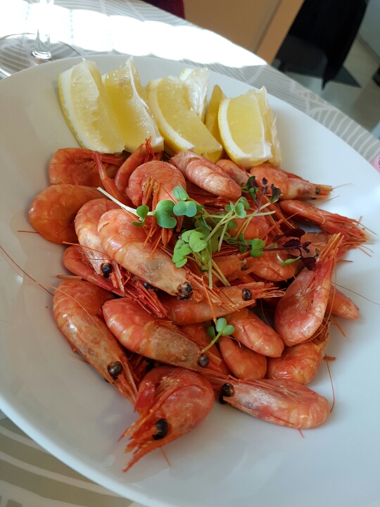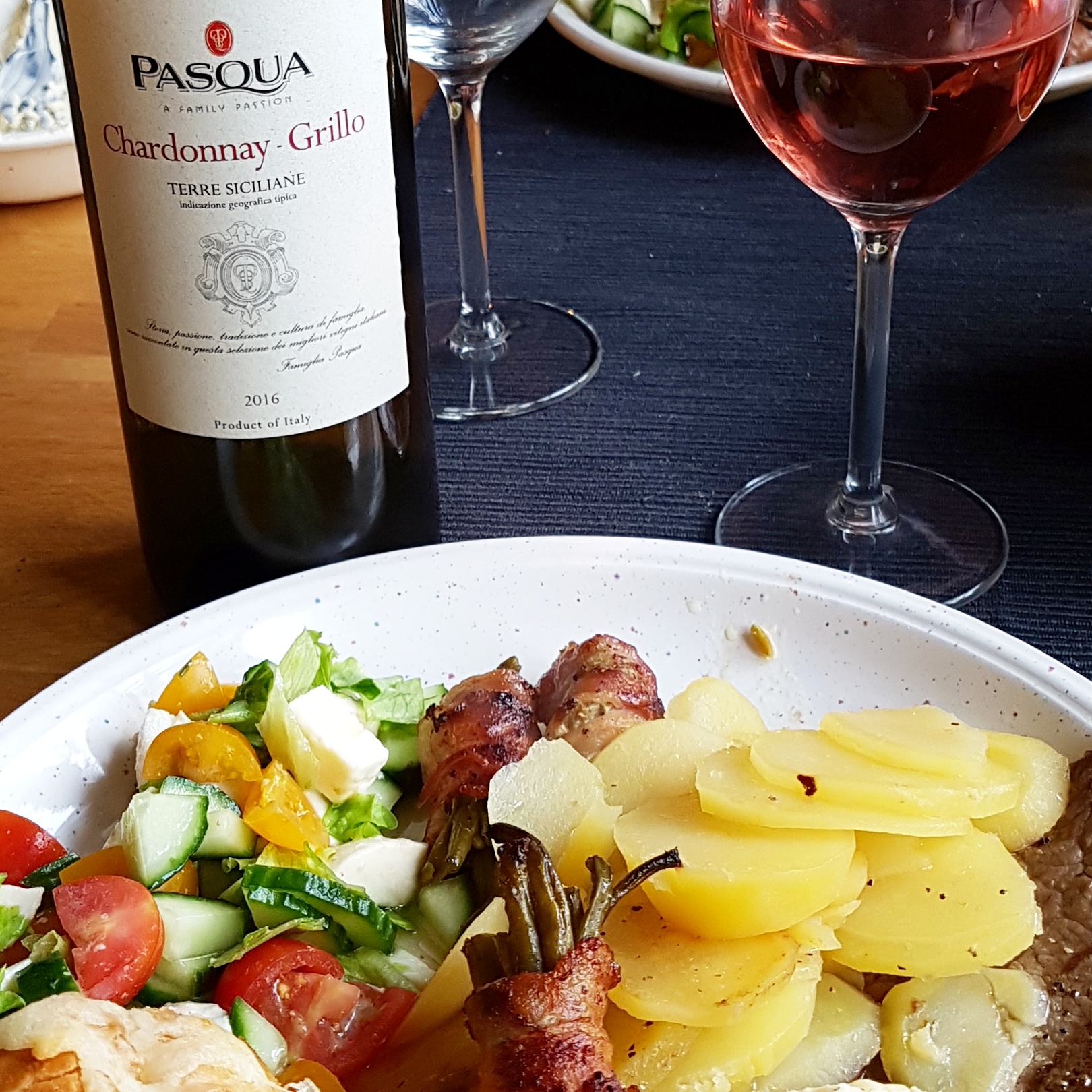 En fin kväll med god mat och trevligt sällskap! Till maten drack vi lite ro´se, fördrink till de rökta räkorna blev Pasqua Chardonnay Grillo. Mycket fruktig smak med inslag av päron, galiamelon, vita blommor och limeskal. Serveras vid 8-10°C. (Nr 12438). Passade utmärkt till!