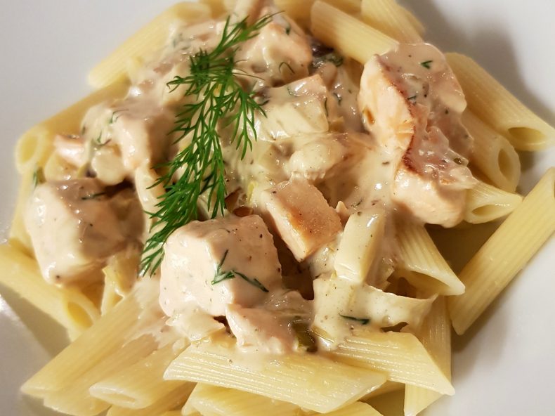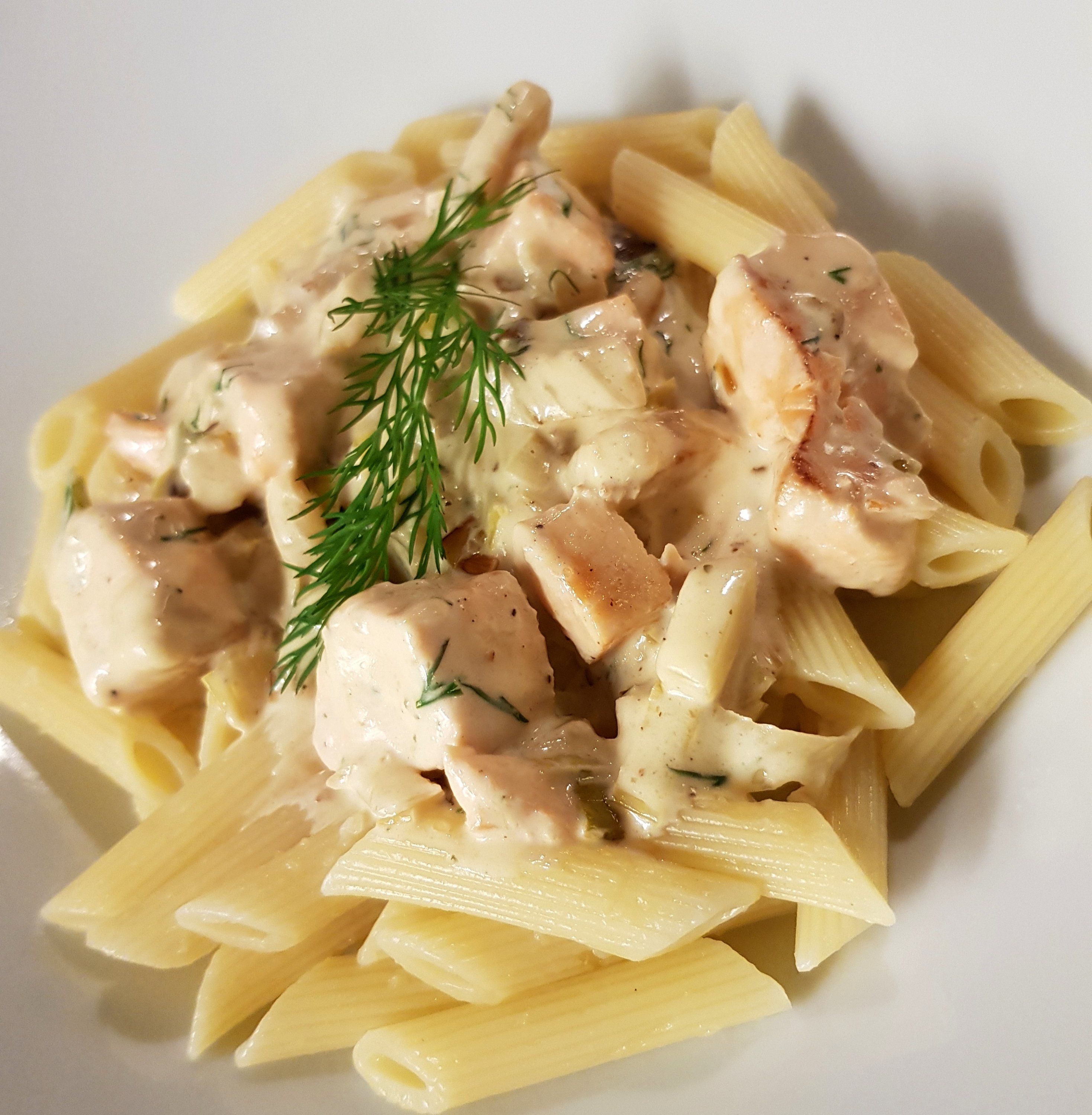 - Häll på grädde och crème fraiche. Lägg i laxbitar och dill. Låt småputtra under lock ca 5 minuter tills laxen är genomkokt.