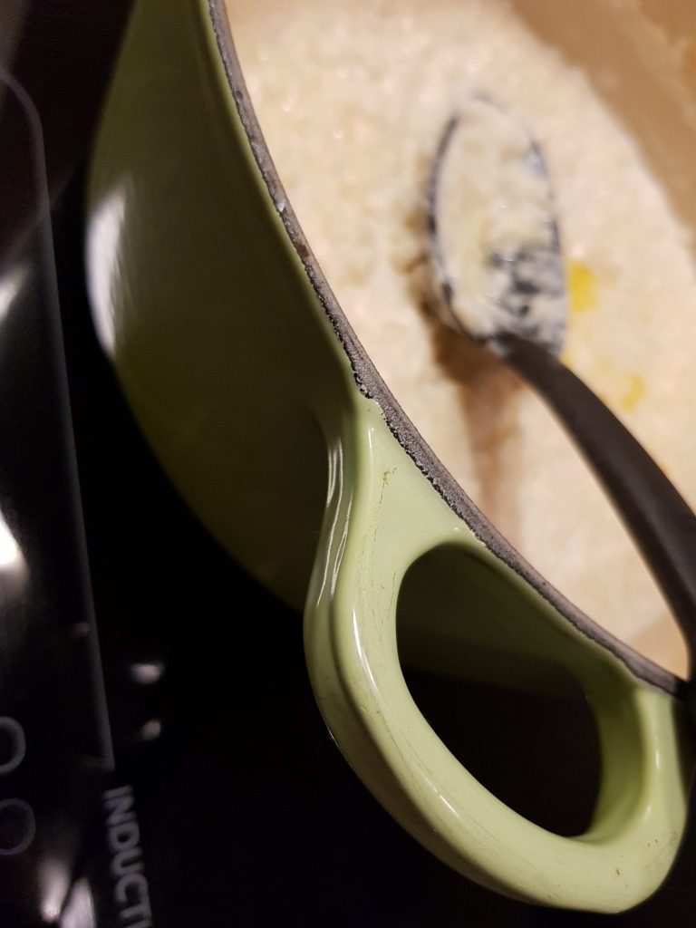 2. Sätt ugnen på 125°. Häll mjölk och grädde i grytan och låt det långsamt sjuda upp. Rör om under tiden.
