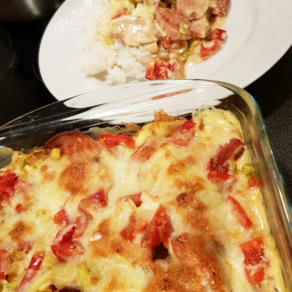 Falukorvsgratäng med purjolök, paprika och sweetchili