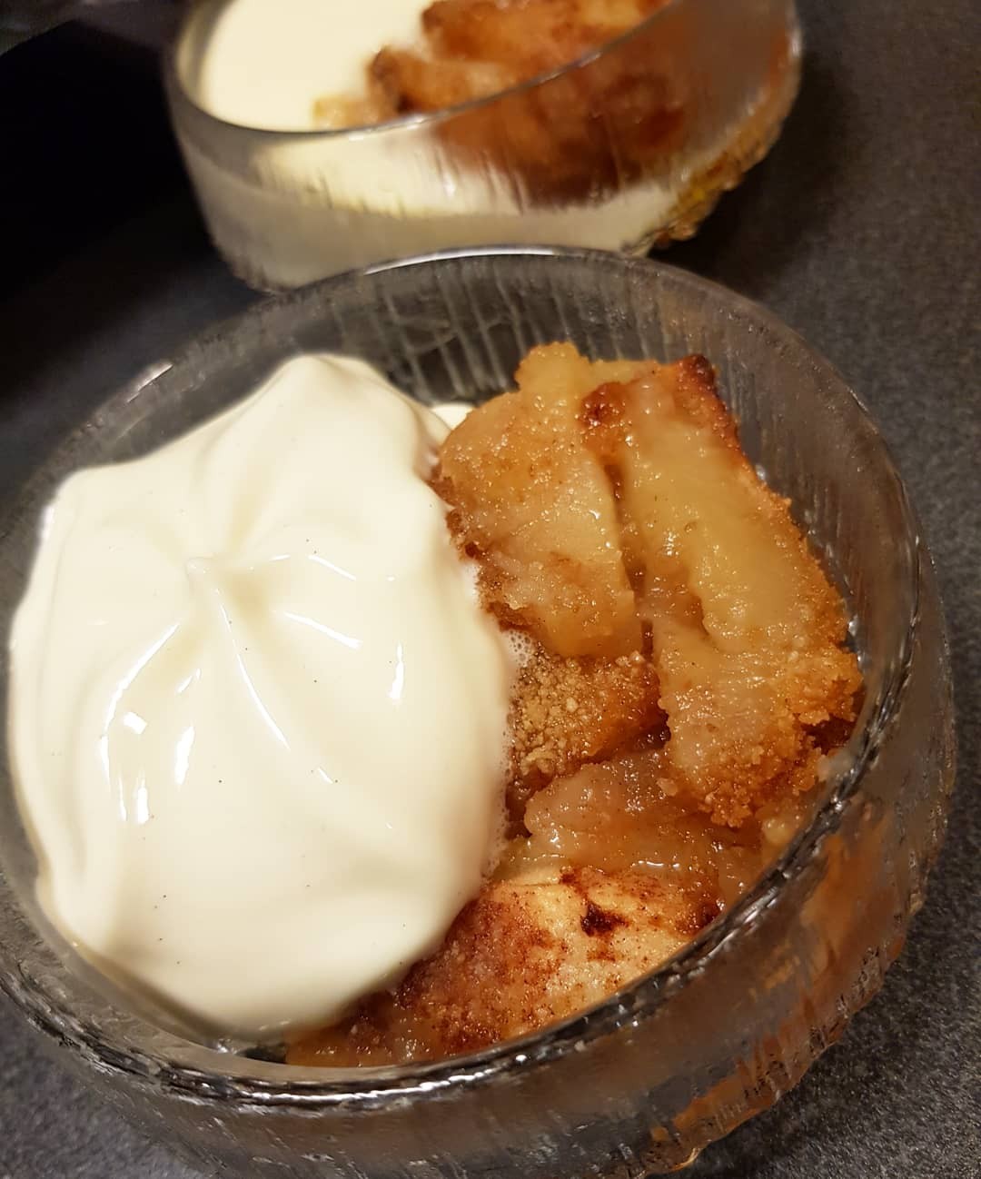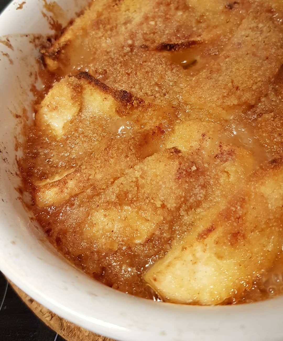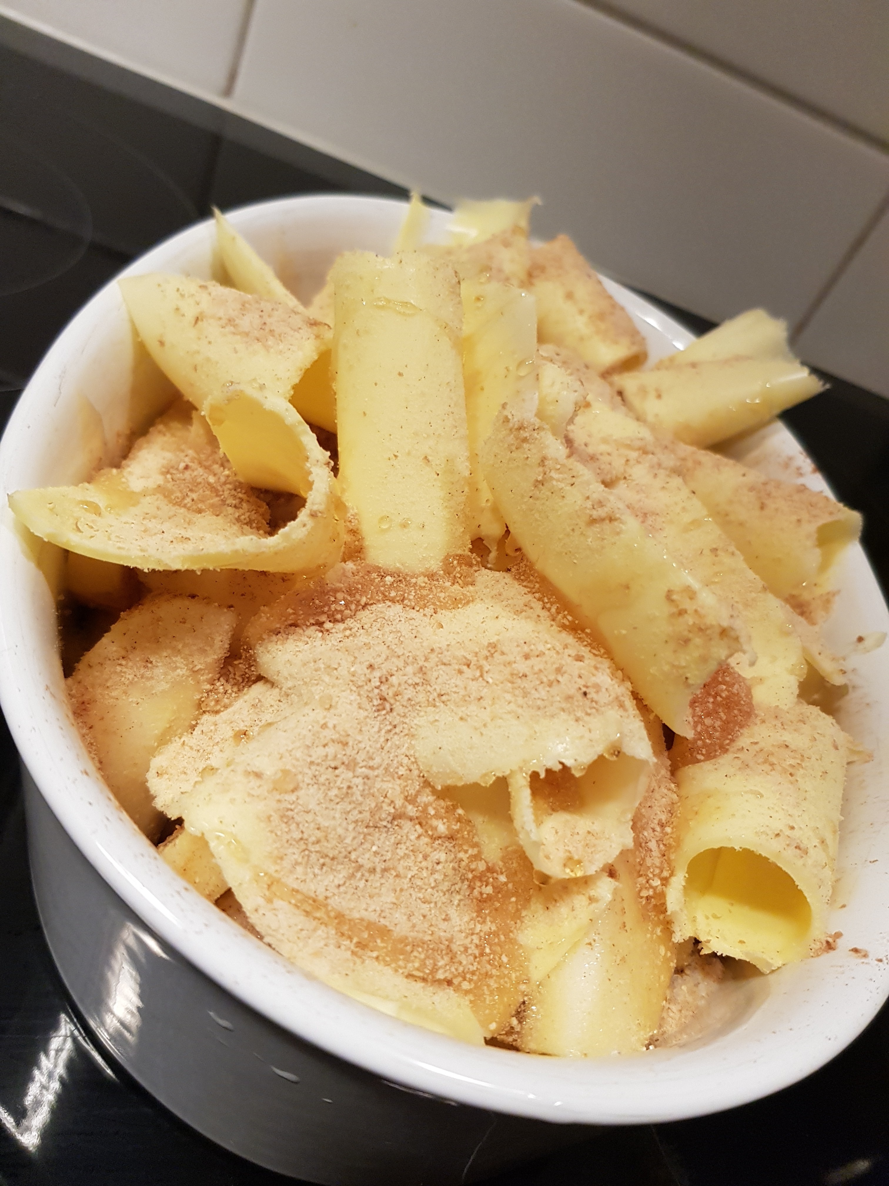 2. Skala och klyfta äpplena och lägg i en form. Sockra mellan varven, använd 3/4 av sockret.