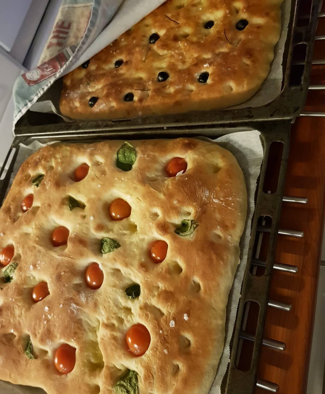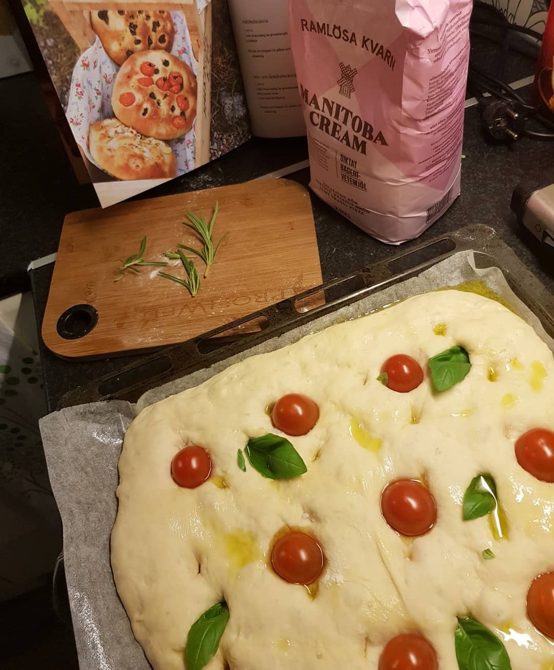 Baka ut degen och jäs den på en plåt enligt grundreceptet. Sätt fingrarna i degen så att det formas en massa hål, ringla över rikligt med olivolja och strö över flingsalt. Strö över tomater och basilika och tryck ner hela tomater och basilikablad i degen.