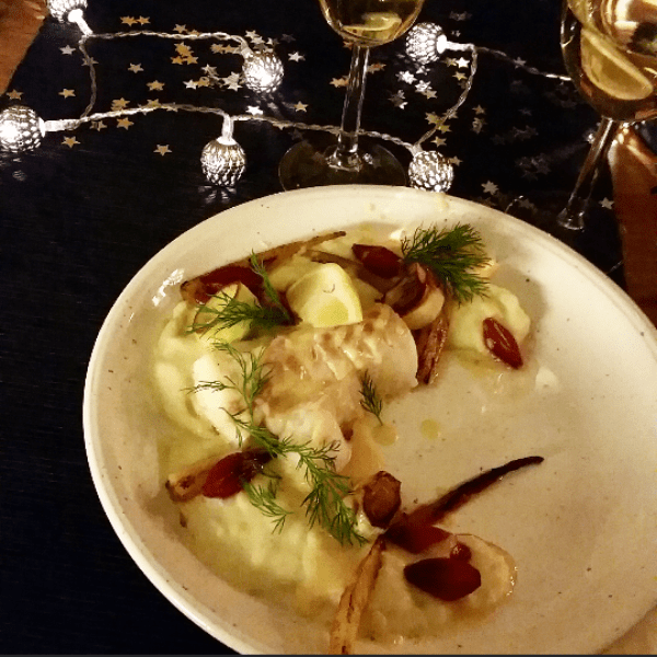 Lättrimmad Torskrygg med jordärtskockpuré, svartbetor, purjolök, picklad lök och Vitvinsås