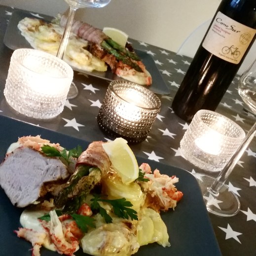 Fläskfile Oscar med bearnaisesås, kräftstjärtar, potatisgratäng och baconlindad sparris