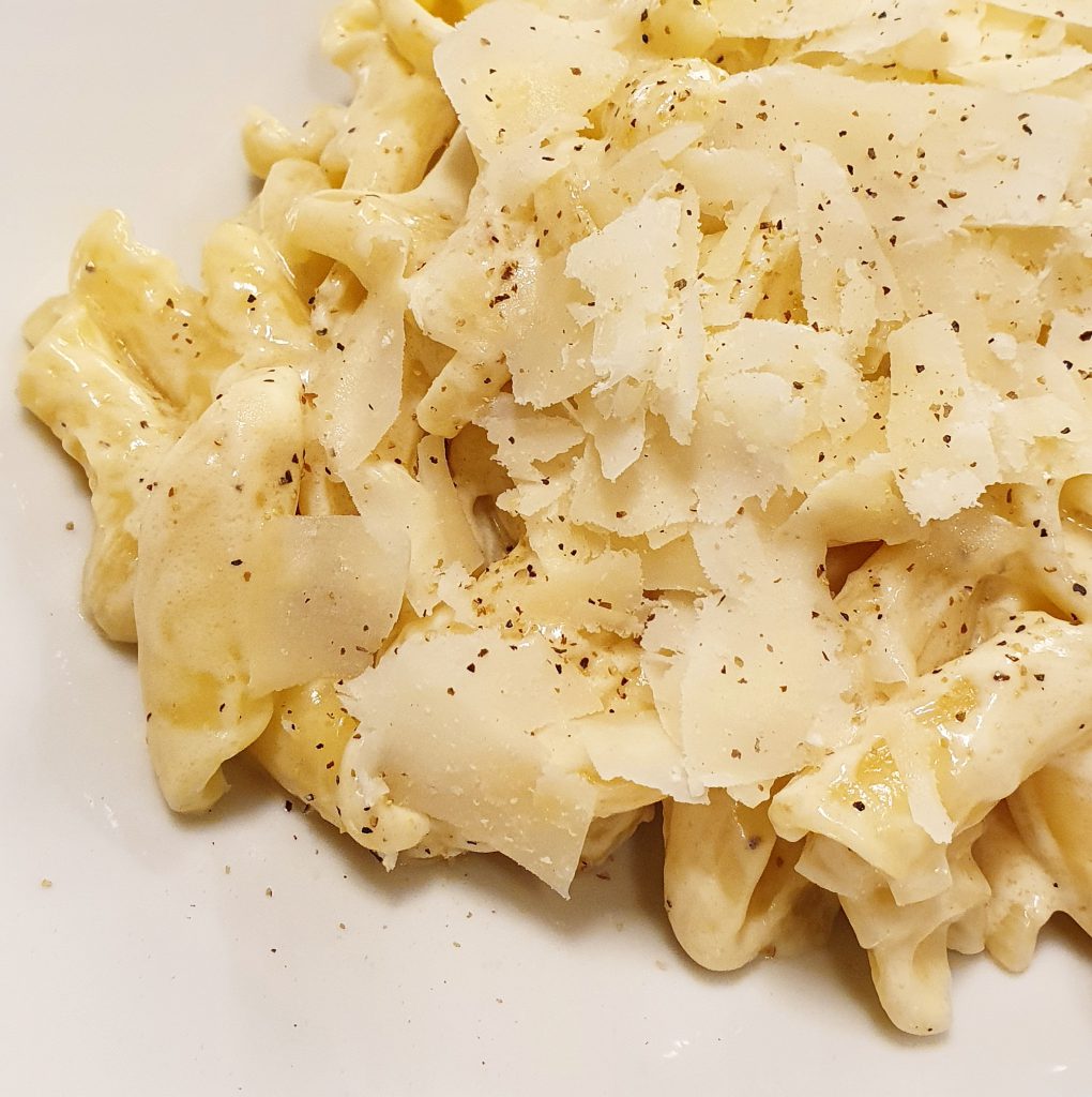 Rör ner pastan i såsen. Servera med riven parmesan och svartpeppar.